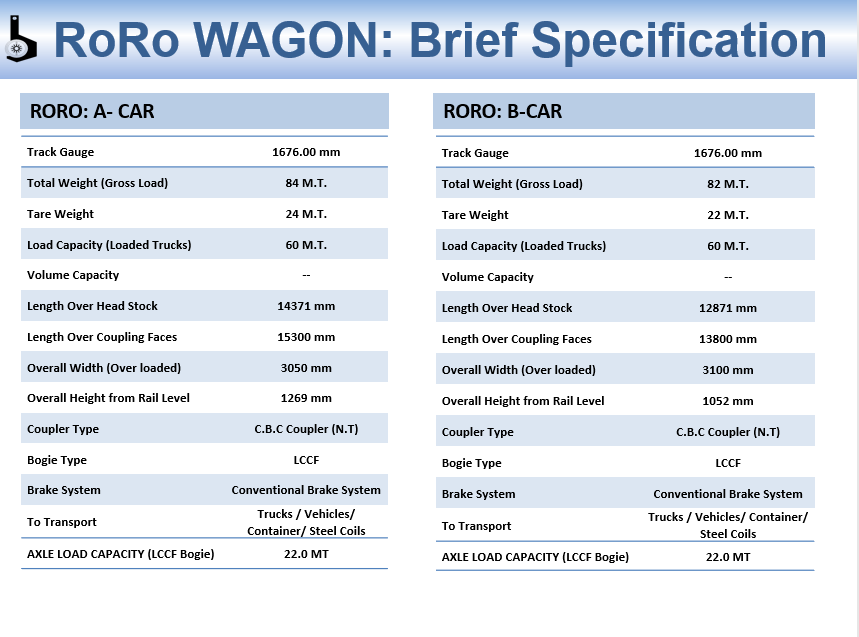 RDSO has designed Low Floor RoRo Wagon dedicatedly for Ro-Ro service. Floor height of this Wagon is 975mm (i.e. 299 mm less than BRN 22.9 Wagon) First prototype wagon is manufactured by Braithwaite & Co. Limited.
